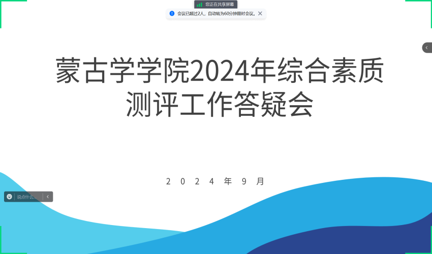 为顺利推进2023-2024年度综合素质测评工作,蒙古学学院于910日晚,通过腾讯会议组织召开了学生骨干工作会议。会议由学工办主任哈申那布其主持,学院综合测评工作组学生代表及各班班长、团支书、学委等30余人参会。