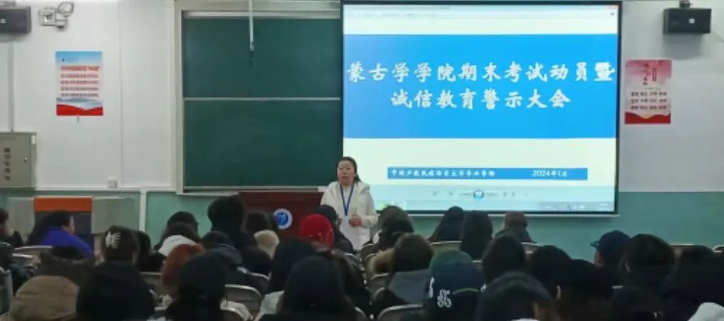 1月5日下午,蒙古学学院在霍林河校区博学楼106教室、304教室分别召开了三场“期末考试动员暨诚信教育警示大会”。会议由学院院长阿拉坦格日乐、副书记温都斯、副院长乌吉斯古冷主持并主讲,学院各年级专业全体参考学生参会。