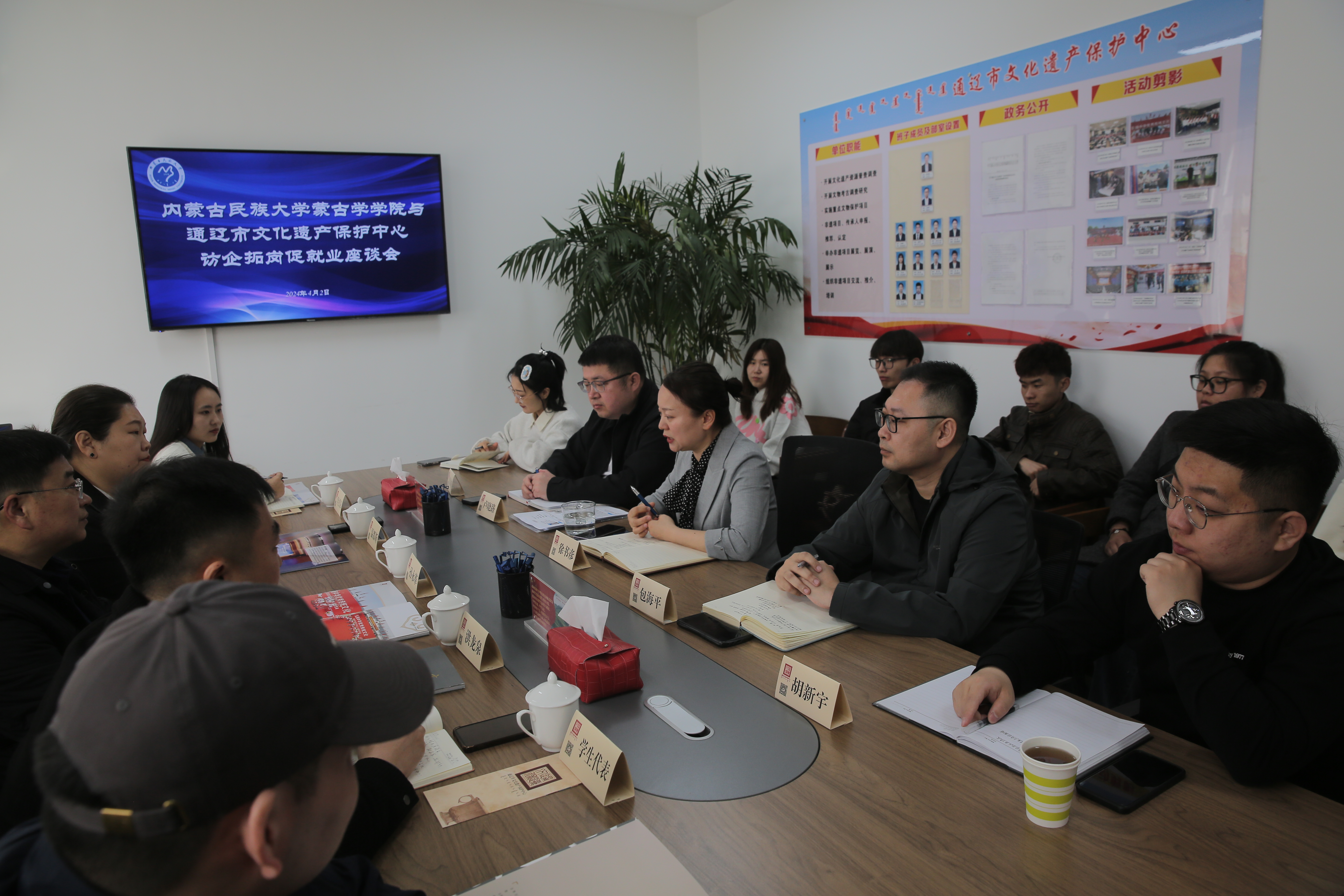 为进一步深化校企合作,促进毕业生高质量就业,4月2日,在通辽市文化遗产保护中心三楼会议室,蒙古学学院与通辽市文化遗产保护中心共同举办了访企拓岗促就业座谈会。学院党委书记孙永革、党委副书记温都斯、通辽市文化遗产保护中心主任徐书彦、通辽市文化遗产保护中心副主任包海平等领导出席座谈会,会议由学院党委书记孙永革主持。