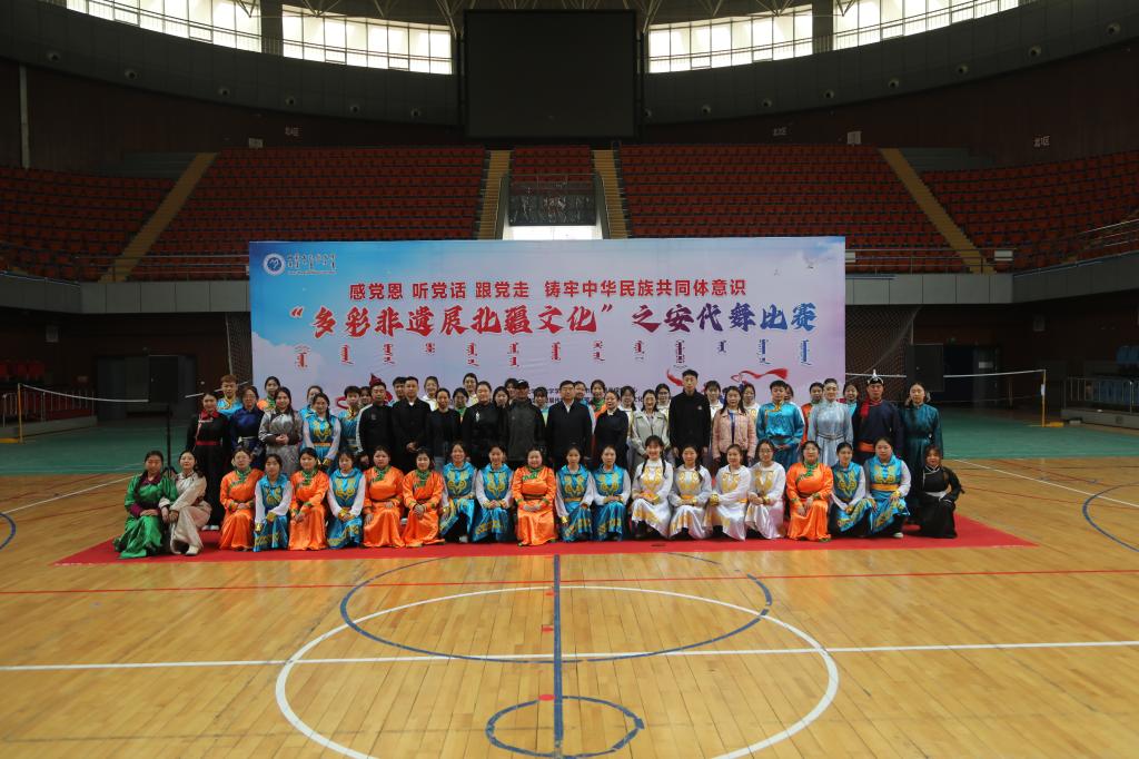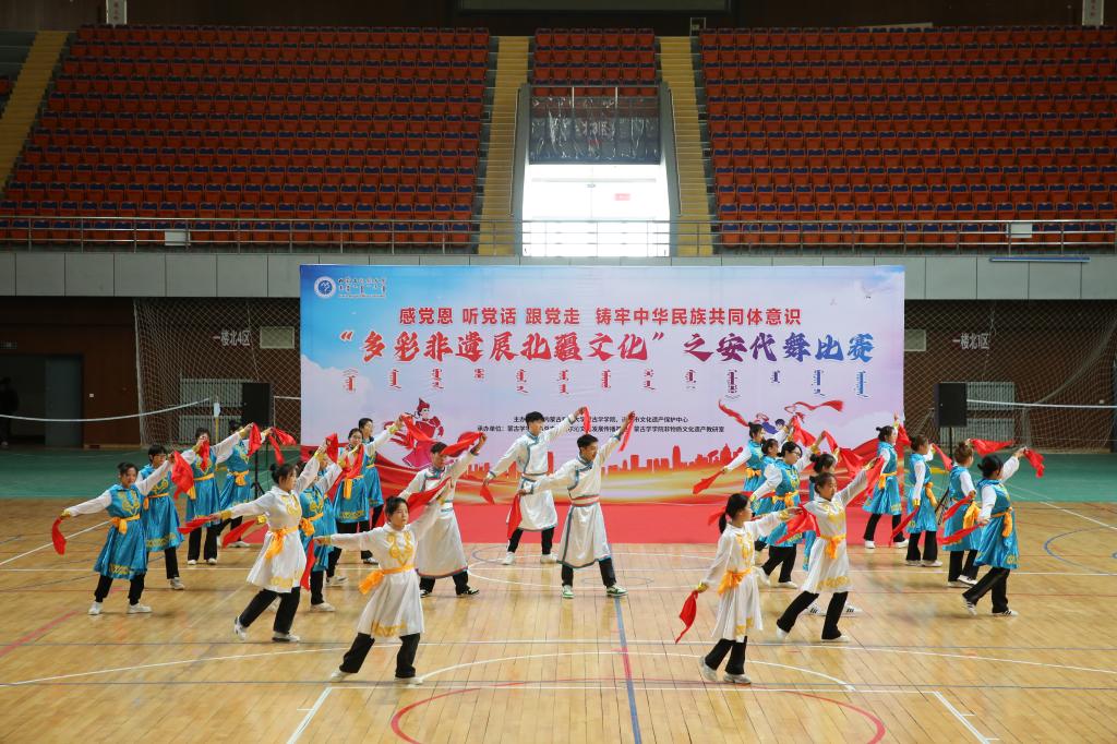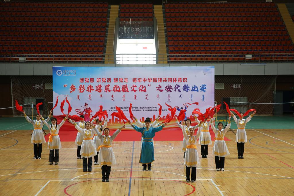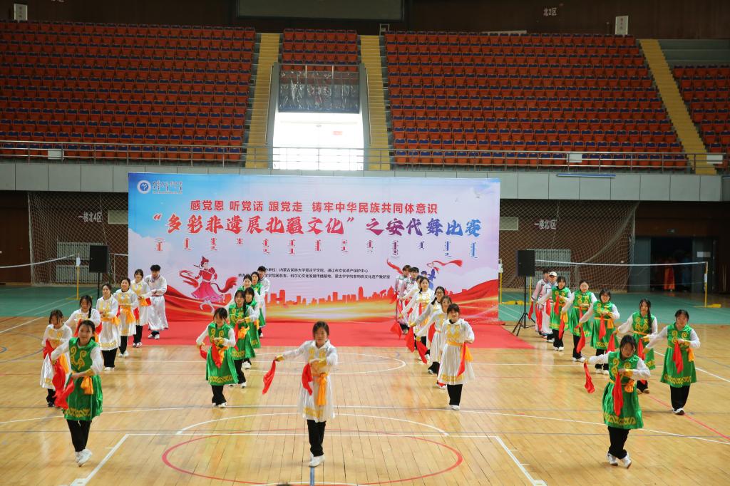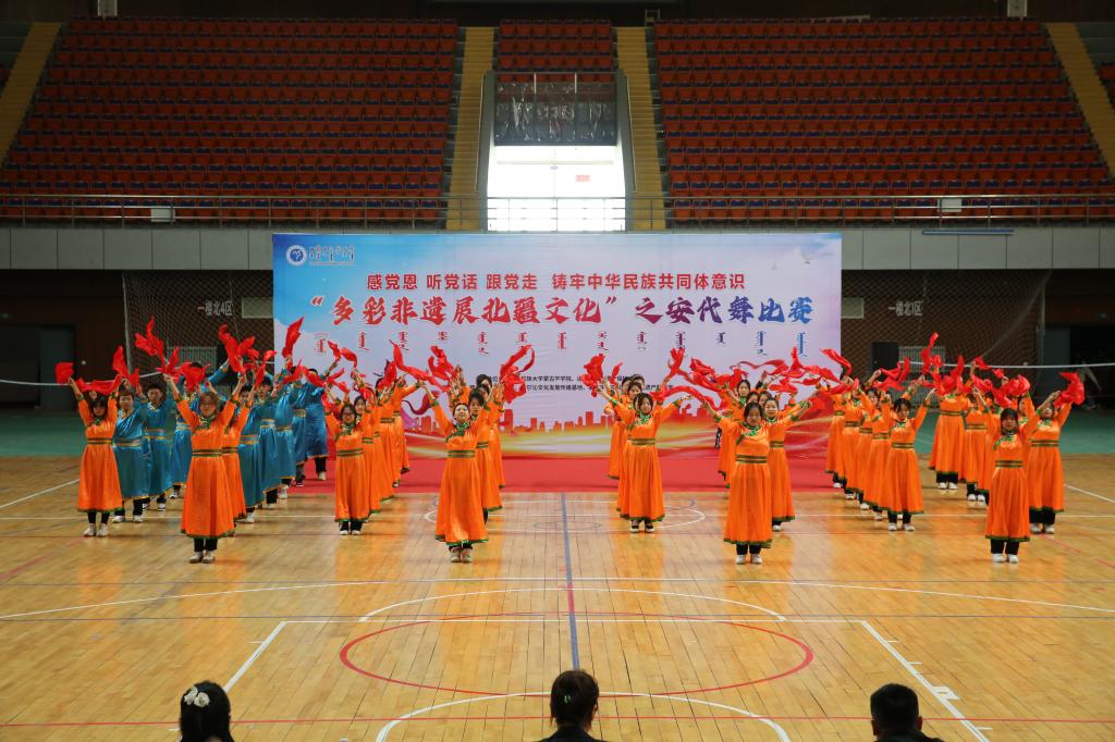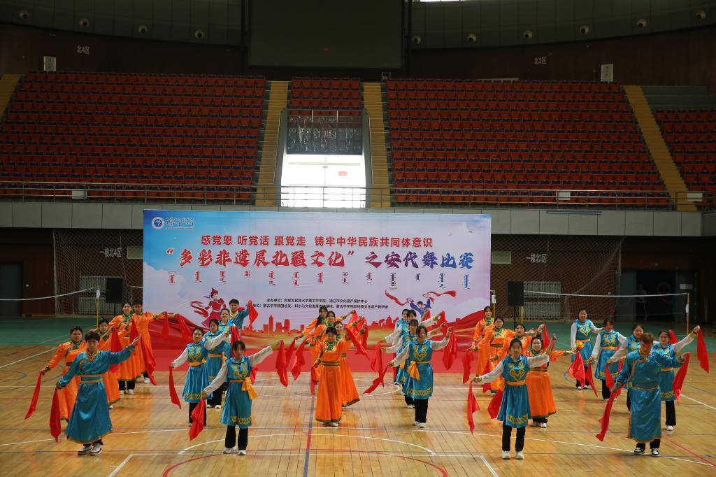 4月27日,蒙古学学院“感党恩听党话跟党走 铸牢中华民族共同体意识‘多彩非遗展北疆文化’之安代舞比赛”在奥体篮球馆举行,比赛由蒙古学学院、通辽市文化遗产保护中心主办,蒙古学学院团总支、科尔沁文化发展传播基地、非物质文化遗产研究中心、蒙古学学院非物质文化遗产教研室承办。蒙古学学院党委书记孙永革、通辽市文化遗产保护中心主任徐书彦、法学院党委书记清河、文学与新闻传播学院党委副书记包宝柱、蒙古学学院党委副书记温都斯、副院长乌吉斯古冷莅临本次比赛。由内蒙古民族大学体育学院王乐、通辽市乌兰牧骑杨凯、内蒙古民族大学党委统战部阿拉腾岱日、通辽市文化遗产保护中心圆圆、吴其力木格担任本次比赛评委。学院全体师生共400余人参加。旨在通过非遗文化的传承和展示,弘扬民族团结精神,进一步铸牢中华民族共同体意识。