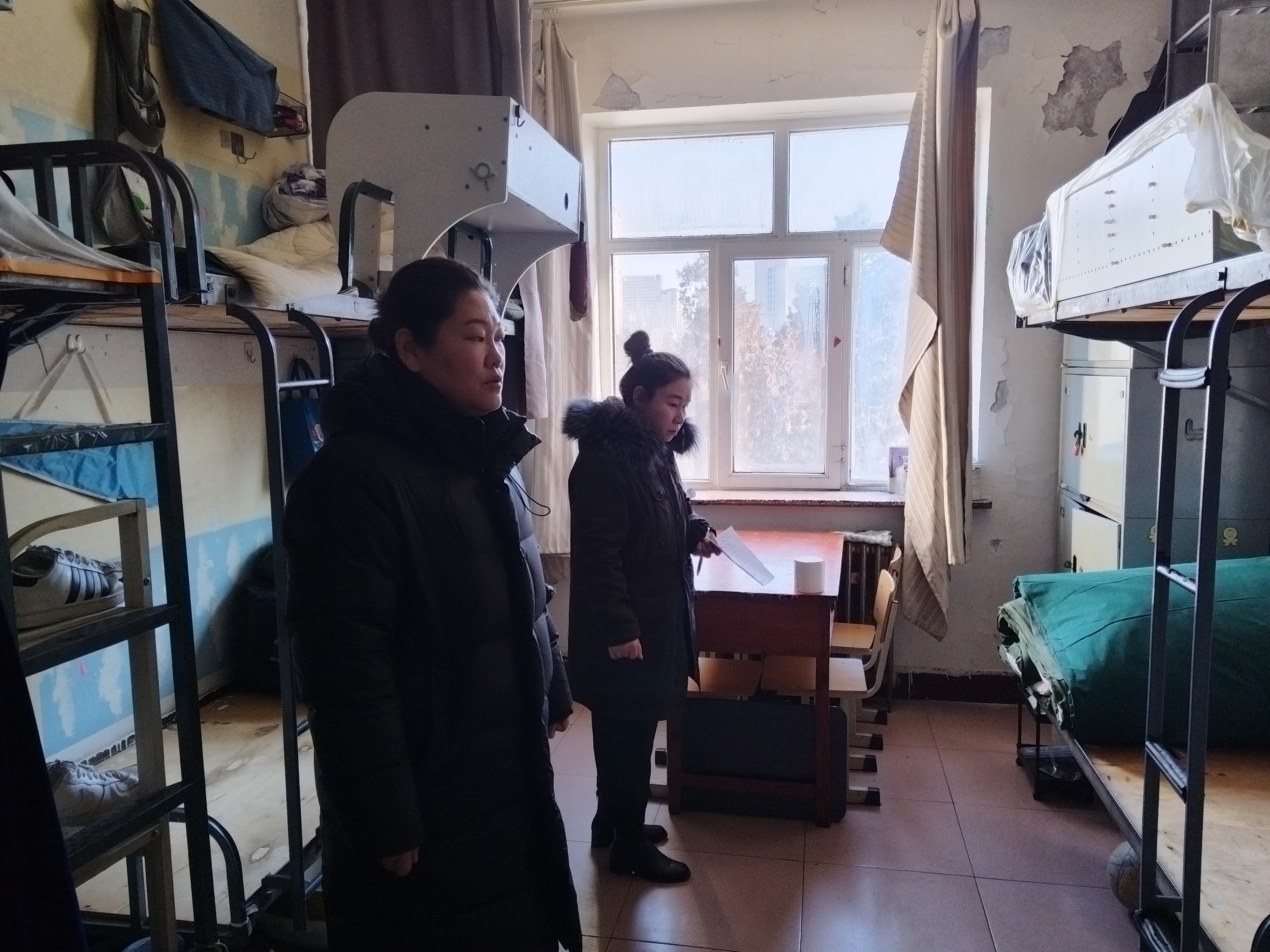 1月6日,温都斯副书记、学工办主任哈申那布其、团总支副书记洪龙泉深入霍林河校区4、5、6号学生公寓进行安全排查,就人走未断电、违规使用电器等对学生进行了批评教育,要求及时进行整改。并在排查中所发现的隐患插座、柜门及时向公寓科反馈报备修缮。