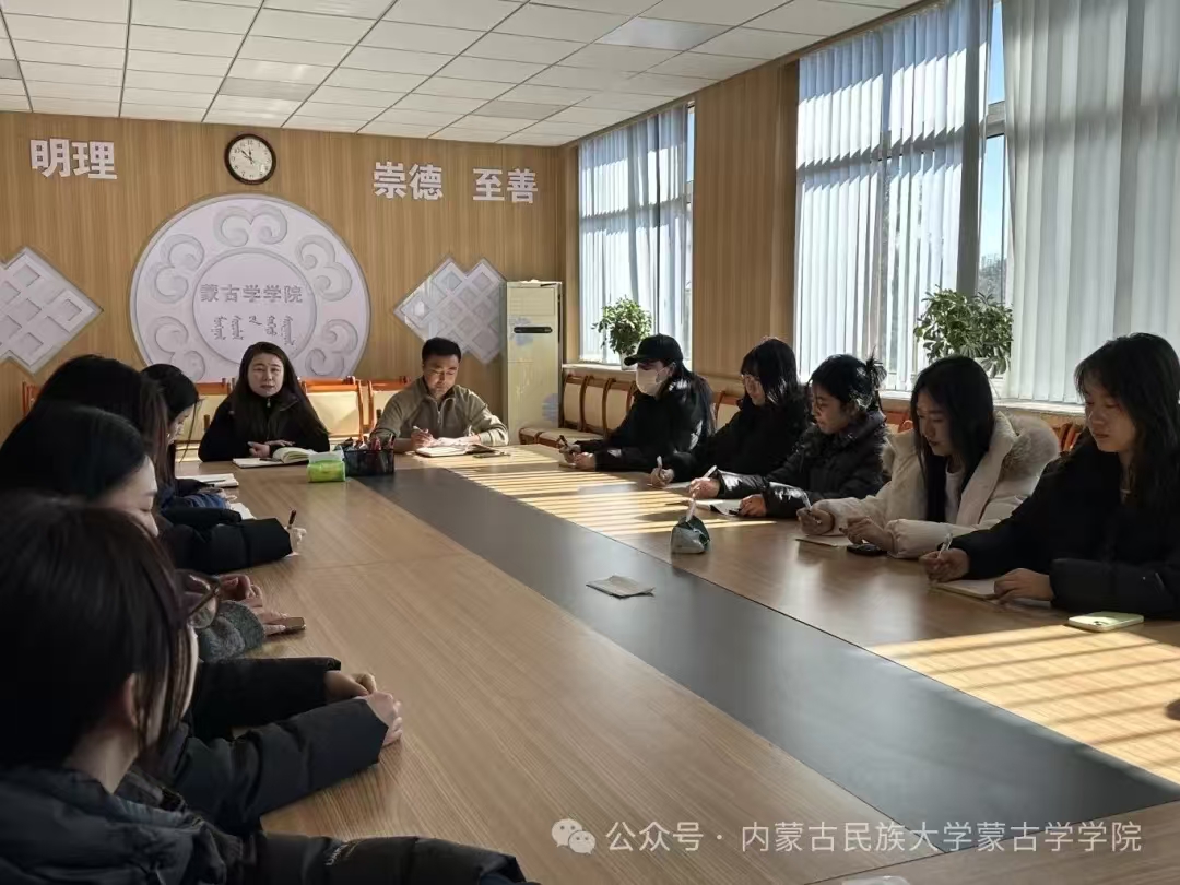 2月19日,在博学楼309会议室召开了蒙古学学院学生干部工作部署会议,学院各学生组织负责人参加,共同回顾过去一年的工作成果,并规划新学期的工作方向。学工办主任哈申那布其参加,会议由团总支副书记洪龙泉主持。