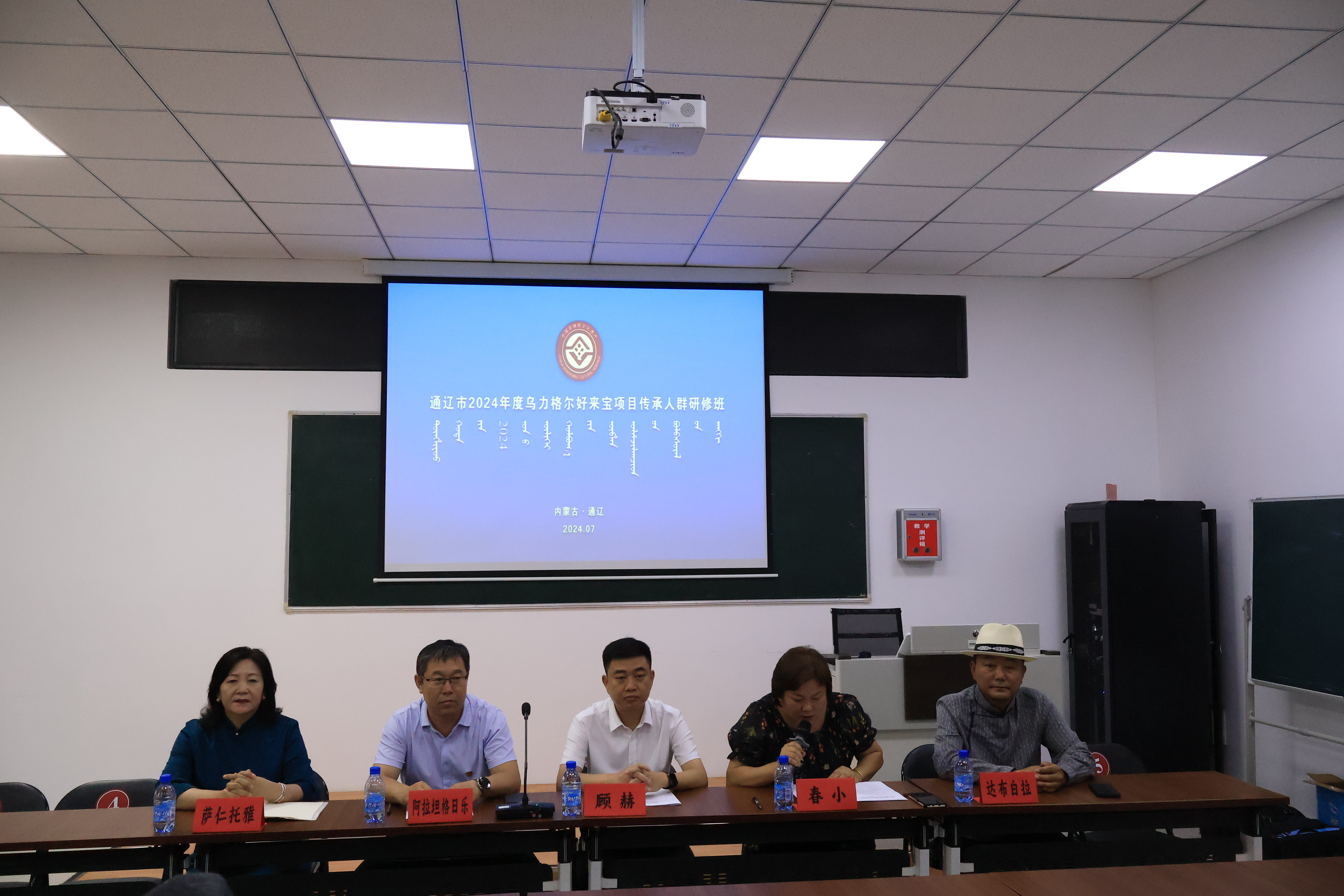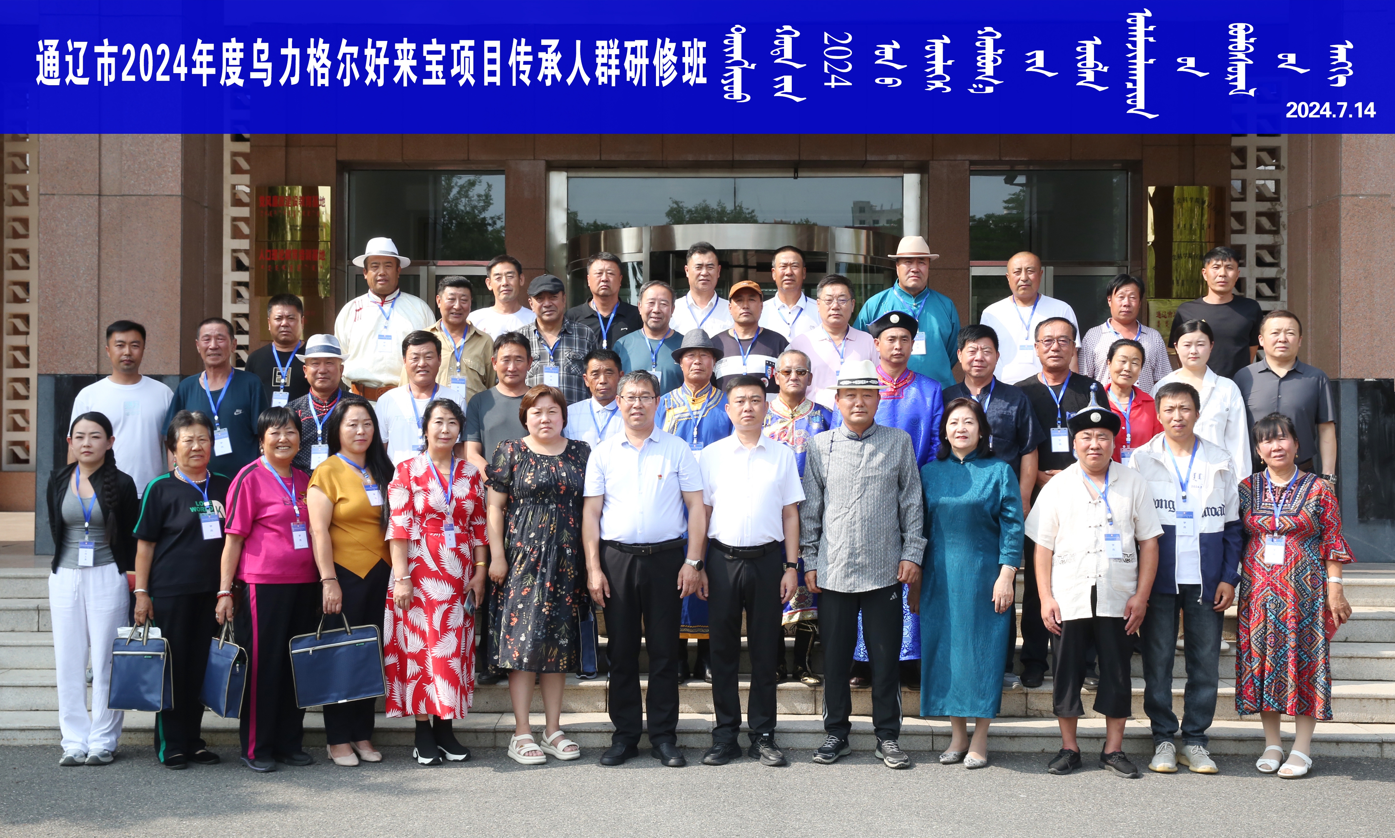 7月14日,由通辽市文化旅游广电局主办,内蒙古民族大学蒙古学学院承办,内蒙古自治区非物质文化遗产研究基地、科尔沁非物质文化遗产研究中心、科尔沁文化发展传播基地、内蒙古东部经济历史文化研究基地、内蒙古民族大学蒙古学学院团总支协办的“2024年度自治区非遗传承人群研培计划-通辽市乌力格尔好来宝项目传承人群研修班”在通辽市委党校开班。