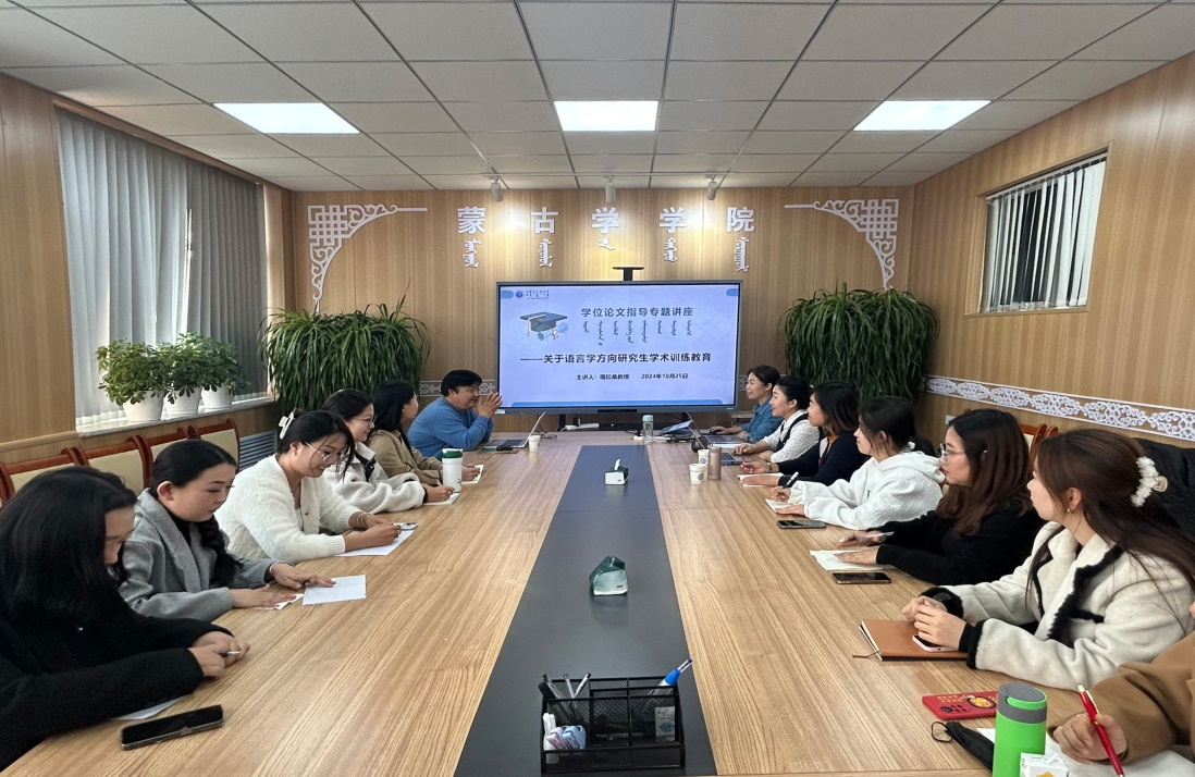 10月25日,蒙古语言教研室于博学楼309会议室成功举办了以“关于语言学方向研究生学术训练教育”为题的专题讲座。本次活动由蒙古语言教研室主任哈斯呼博士主持,研究生指导教师嘎拉桑教授担任主讲,语言学研究方向的青年指导教师及研究生共30余人参加。
